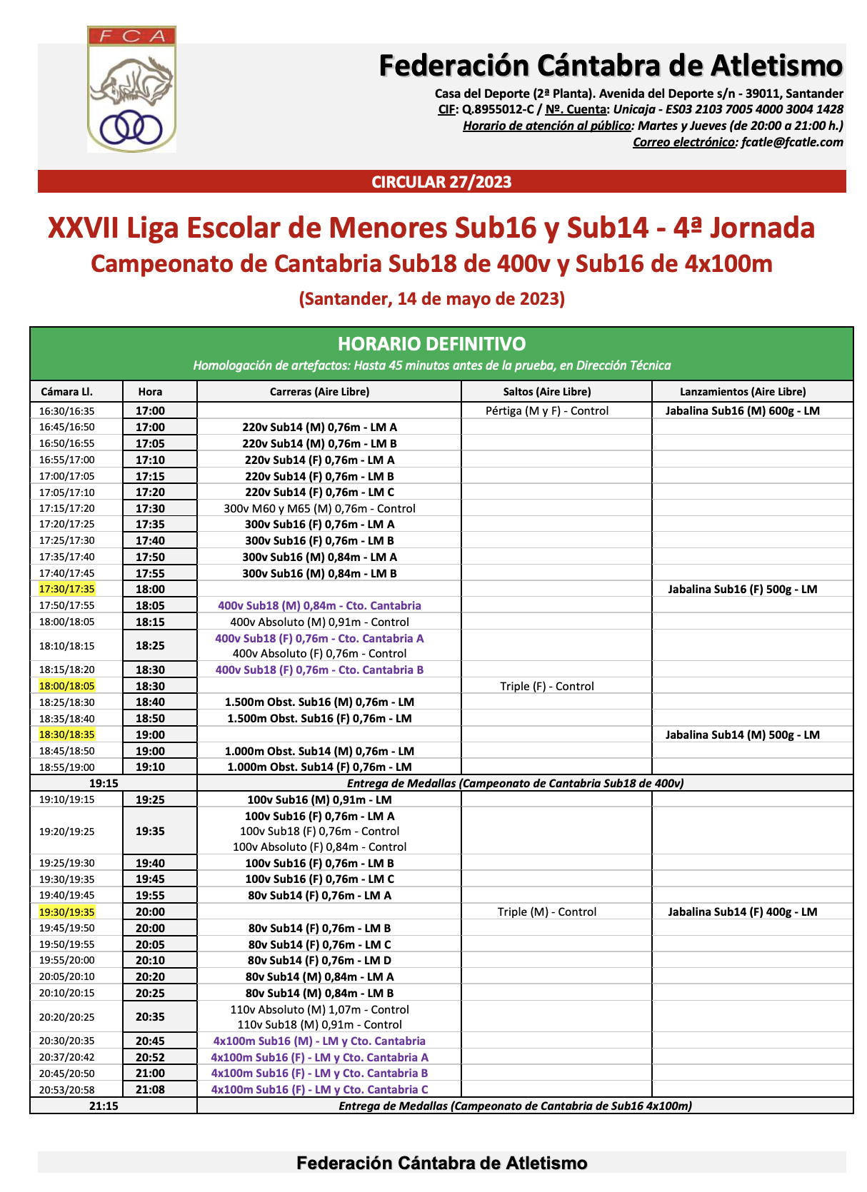 Circular FCA 27/2023 – Reglamento y horario (DEFINITIVO) Atletas inscritos (DEFINITIVO) Impreso de confirmación de relevos (entregar en Secretaría, hasta una hora antes) Reglamento – XXVII Liga Escolar de Menores (2023) / Más información Competición[...]